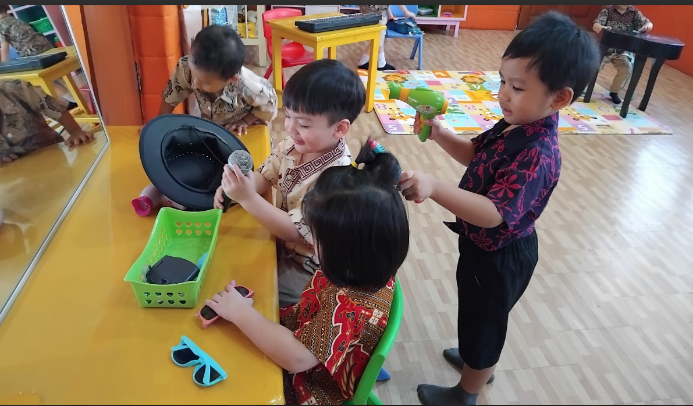 Melalui sentra main peran, anak-anak diberi kesempatan untuk berperan sebagai tokoh dalam sebuah cerita sederhana. Mereka dapat berpura-pura menjadi penonton, pemain film, atau bahkan sutradara kecil yang mengarahkan teman-temannya. Kegiatan ini tidak hanya melatih keberanian anak untuk tampil, tetapi juga membantu mereka memahami alur cerita secara alami melalui bermain.