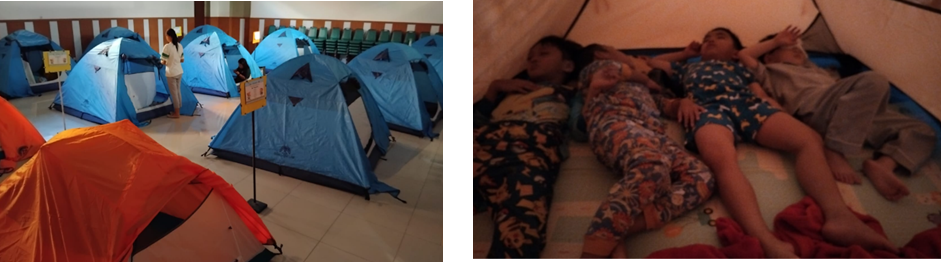 Menjelang siang, anak-anak menikmati makan siang bersama dalam suasana kebersamaan yang hangat. Setelah itu, mereka bersiap untuk tidur siang di dalam tenda yang memberikan pengalaman baru menyenangkan layaknya berkemah. Kegiatan dilanjutkan dengan mandi sore dan menikmati camilan sore berupa teh hangat serta biskuit yang membuat tubuh kembali segar.