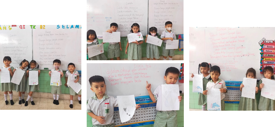 Proses pembuatan puisi ini berlangsung seru dan kolaboratif. Setiap anak menyumbangkan satu hingga dua kalimat singkat yang jujur dan polos sesuai dengan judul kelompoknya. Setelah untaian kata terkumpul menjadi sebuah bait yang utuh, setiap anak dengan telaten menyalin puisi tersebut di kertas masing-masing. Sebelum tampil, mereka menyempatkan diri untuk membaca bersama di dalam kelompok guna melatih kelancaran dan kekompakan. Momen ini menjadi sarana belajar yang luar biasa bagi mereka untuk menghargai ide teman sejawat dan berlatih fokus pada tugas yang diberikan.