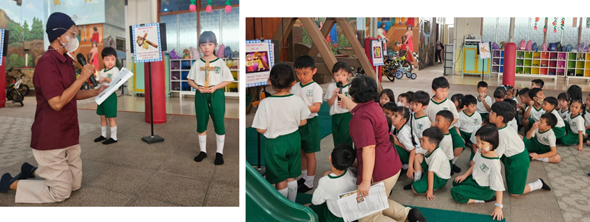 Ibadat Jalan Salib untuk kelompok TK A dibuka dengan doa yang dipimpin oleh Bu Irene, sedangkan ibadat untuk kelompok TK B dipimpin oleh Bu Tari. Dalam suasana yang tenang, anak-anak diajak untuk mempersiapkan hati dalam mengikuti setiap rangkaian ibadat.