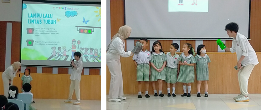 Dalam kegiatan ini, tim PUSPAGA memberikan edukasi dengan cara yang ramah anak melalui video pembelajaran “Lampu Lalu Lintas Tubuh”. Anak-anak dikenalkan dengan simbol lampu merah untuk bagian tubuh yang tidak boleh disentuh orang lain, yaitu dada, area kemaluan, pantat, dan mulut. Sementara itu, lampu hijau digunakan untuk menjelaskan bagian tubuh yang boleh disentuh, seperti kepala, tangan, dan kaki.