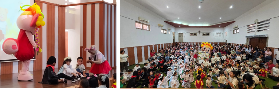 Salah satu penampilan yang paling memikat adalah drama dari anak-anak Kelompok Bermain (KB) dan Taman Kanak-kanak (TK) yang mengangkat kisah hidup Santa Angela. Dengan kostum yang menggemaskan dan penuh percaya diri, anak-anak menampilkan cerita tentang keteladanan, keberanian, dan kasih yang diajarkan oleh Santa Angela. Penampilan ini bukan sekadar hiburan, melainkan juga menjadi sarana pembelajaran karakter yang menyentuh hati para orang tua serta tamu yang hadir.