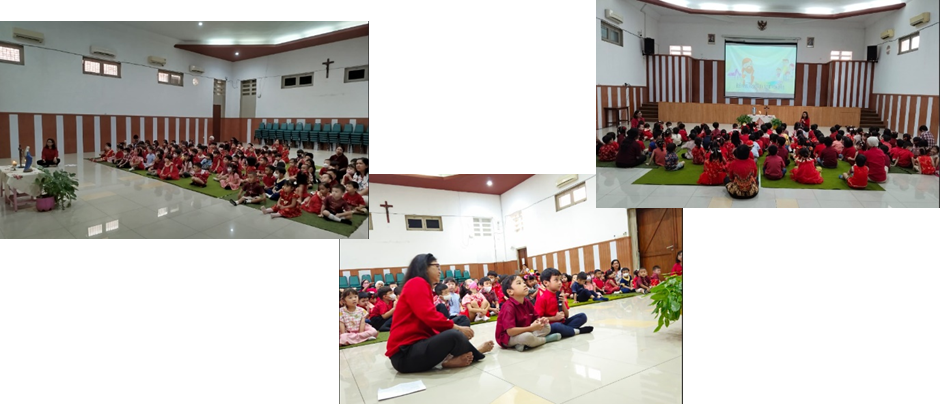 Perayaan dimulai dengan ibadat syukur yang dilaksanakan di aula KB-TK. Dalam suasana khidmat dan sederhana, anak-anak diajak untuk mengucap syukur atas penyertaan Tuhan dalam kehidupan mereka. Melalui doa dan lagu pujian, anak-anak belajar bahwa setiap perayaan adalah kesempatan untuk bersyukur, berbagi, dan menumbuhkan kasih kepada sesama.