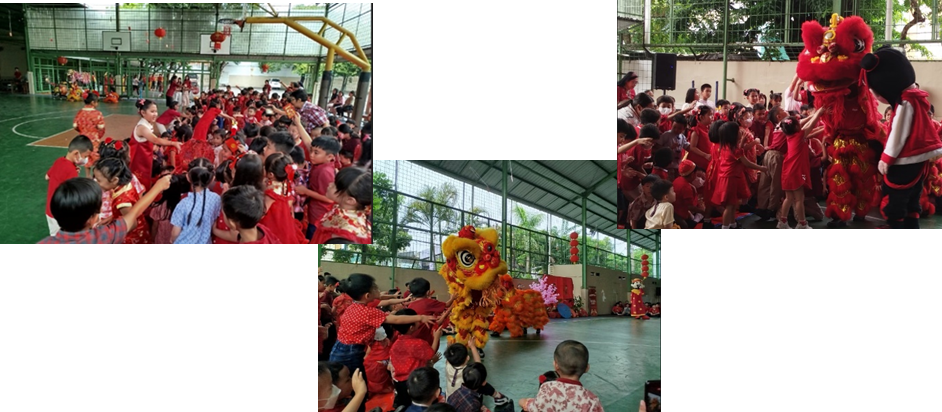 Setelah ibadat, seluruh anak bersama para guru menuju lapangan basket untuk menyaksikan pertunjukan barongsai yang meriah. Penampilan barongsai kali ini terasa istimewa karena turut dimeriahkan oleh kakak-kakak SD Santa Maria. Gerakan lincah dan irama tabuhan yang semangat membuat anak-anak terpukau dan bersorak gembira.