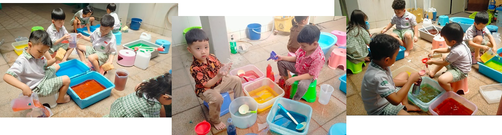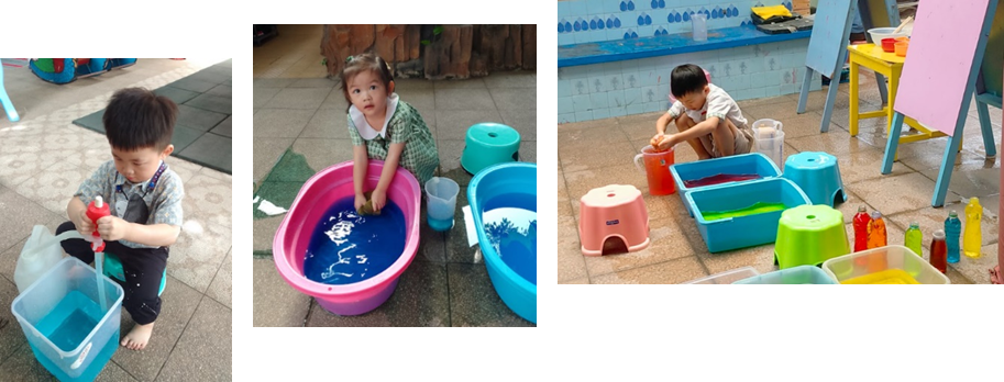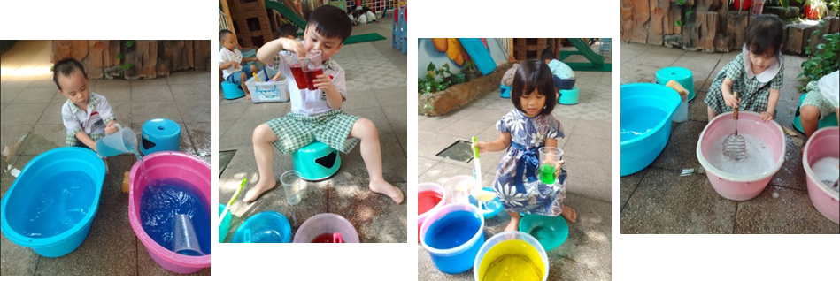Pada kegiatan bermain air kali ini, anak-anak diajak mengeksplorasi berbagai aktivitas, seperti mencampur tiga warna dasar (merah, kuning, dan biru) untuk mengamati perubahan warna, mengocok air sabun hingga menghasilkan busa, memindahkan air menggunakan spons dengan cara menyerap dan memeras, menggunakan pompa mini, serta menuang air menggunakan gelas ukur ke dalam ember. Melalui rangkaian kegiatan tersebut, anak-anak tidak hanya merasakan keseruan bermain air, tetapi juga belajar memahami konsep sederhana seperti sains, sebab-akibat, ukuran, dan perubahan bentuk.