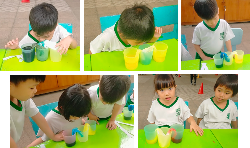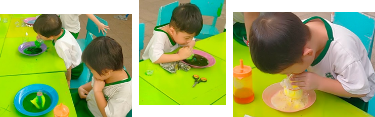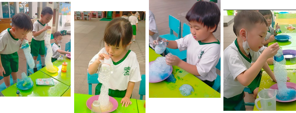Keseruan berlanjut saat kami mencoba eksperimen "Gelembung Pelangi Panjang". Menggunakan botol air mineral yang dipotong bagian bawahnya dan ditutup dengan tisu basah yang diberi pewarna, anak-anak belajar tentang tekanan udara. Saat ditiup dari mulut botol, muncul gelembung kecil dalam jumlah banyak yang menyatu menjadi barisan gelembung panjang berwarna-warni. Scott, anak TK B1, berteriak kegirangan sambil menunjukkan hasil tiupannya, "Wah, aku bisa bikin ular pelangi! Panjang sekali, Bu, seperti belalai gajah!" Kegembiraan seperti inilah yang membangun rasa percaya diri anak bahwa mereka mampu menciptakan sesuatu yang menakjubkan dari barang bekas di sekitar mereka.